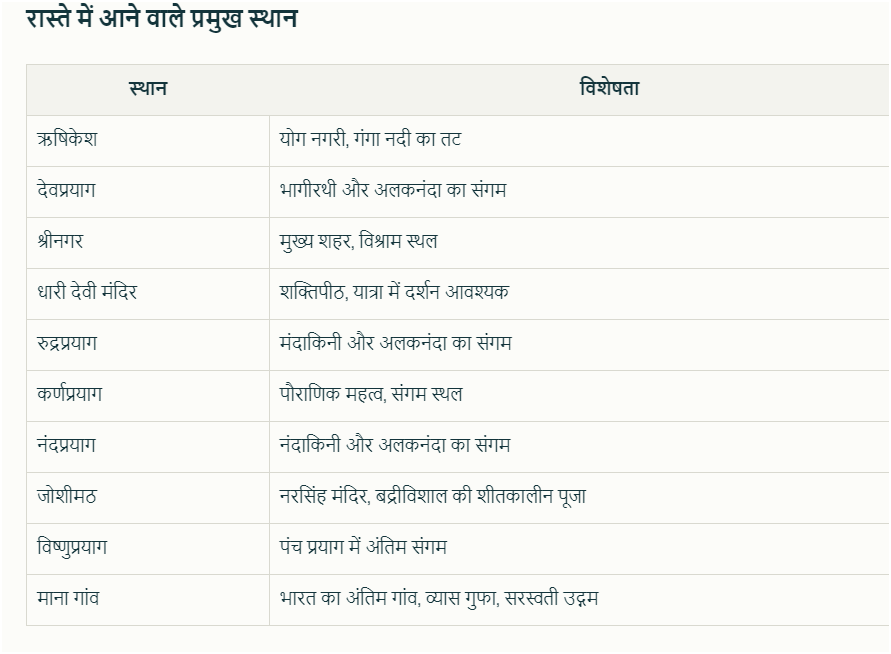 मुख्य मार्ग: हरिद्वार → ऋषिकेश → देवप्रयाग → श्रीनगर → रुद्रप्रयाग → कर्णप्रयाग → नंदप्रयाग → जोशीमठ → बद्रीनाथ।