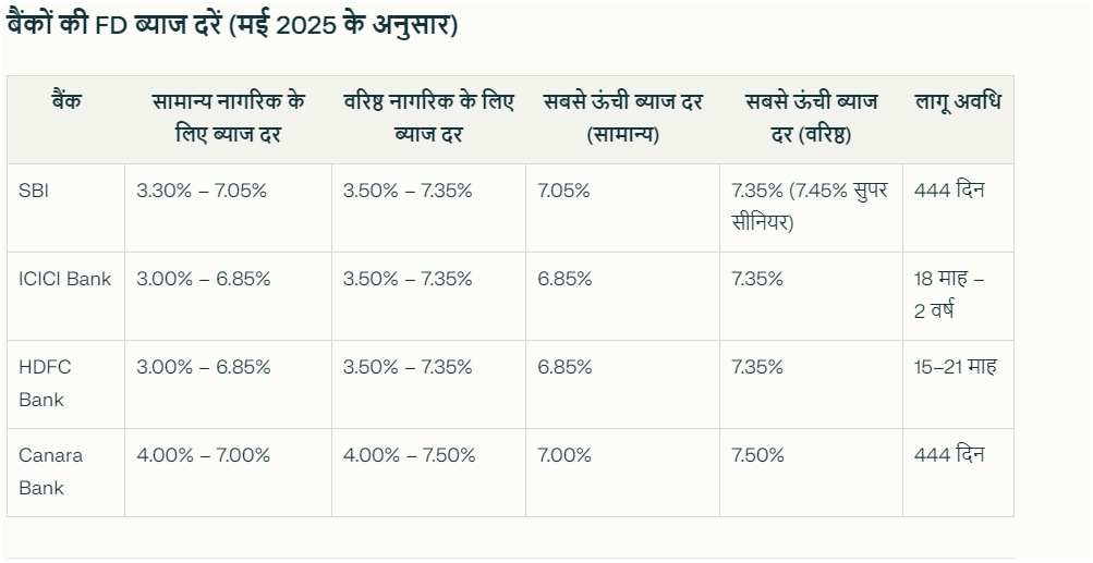 1. FD में सबसे ज्यादा ब्याज कौन सा बैंक देता है?वरिष्ठ नागरिकों के लिए Canara Bank (7.50%) और सामान्य नागरिकों के लिए HDFC/ICICI Bank (6.85%) सबसे ज्यादा ब्याज देते हैं।2. क्या FD पर ब्याज दरें बदलती रहती हैं?हां, बैंकों की FD ब्याज दरें समय-समय पर बदलती रहती हैं। निवेश करने से पहले ताजा दरें जरूर जांचें।3. क्या FD पर टैक्स लगता है?हां, FD से मिलने वाले ब्याज पर टैक्स लगता है, अगर वह सालाना ₹40,000 (वरिष्ठ नागरिकों के लिए ₹50,000) से ज्यादा हो।4. क्या FD सुरक्षित है?सरकारी और बड़े प्राइवेट बैंकों की FD को सुरक्षित माना जाता है। DICGC के तहत ₹5 लाख तक की सुरक्षा मिलती है।