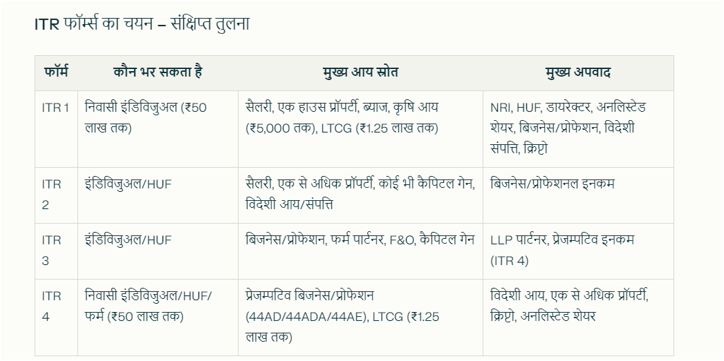 सही ITR फॉर्म का चुनाव आपकी आय के स्रोत, टैक्सपेयर की श्रेणी और कुछ विशेष शर्तों पर निर्भर करता है। फॉर्म चुनने में गलती करने से टैक्स रिटर्न डिफेक्टिव हो सकता है और रिफंड में देरी या पेनल्टी लग सकती है। ऊपर दिए गए गाइड और तालिका के अनुसार अपनी प्रोफाइल के हिसाब से सही फॉर्म चुनें और समय पर टैक्स रिटर्न फाइल करें2546।